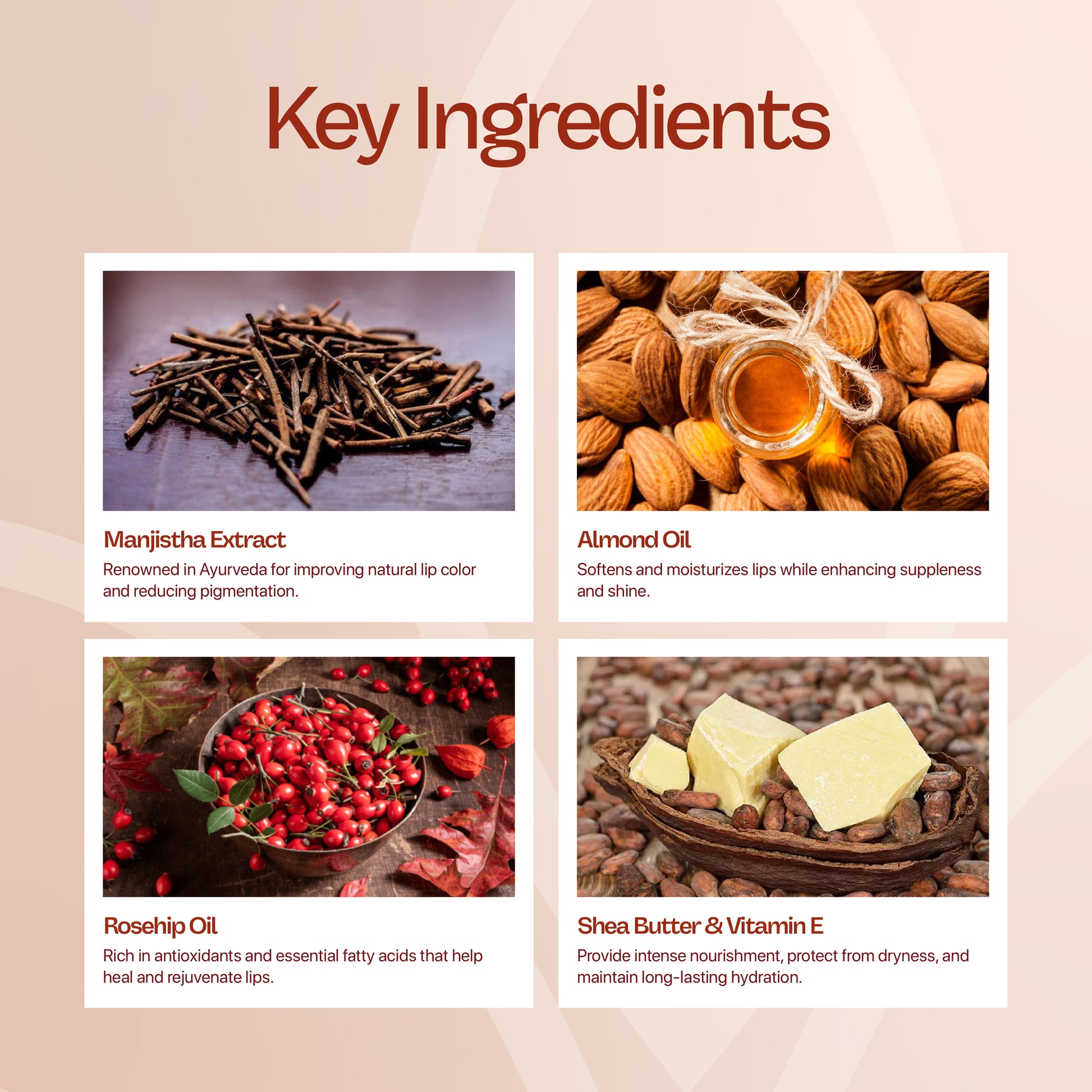 An Ayurvedic serum infused with Manjistha Extract, a supreme Rakta-Shodhaka, it actively addresses Vyanga (discoloration/pigmentation) and dullness caused by Pitta aggravation. The base of Castor and Coconut Oils provides profound Snehana (deep oilation) and Vata-Shamana, countering Ruksha (dryness) and promoting deep healing. Enhanced with Vitamin E, the lightweight serum nourishes, protects, and restores the lips to a smooth, vibrant, and naturally radiant state