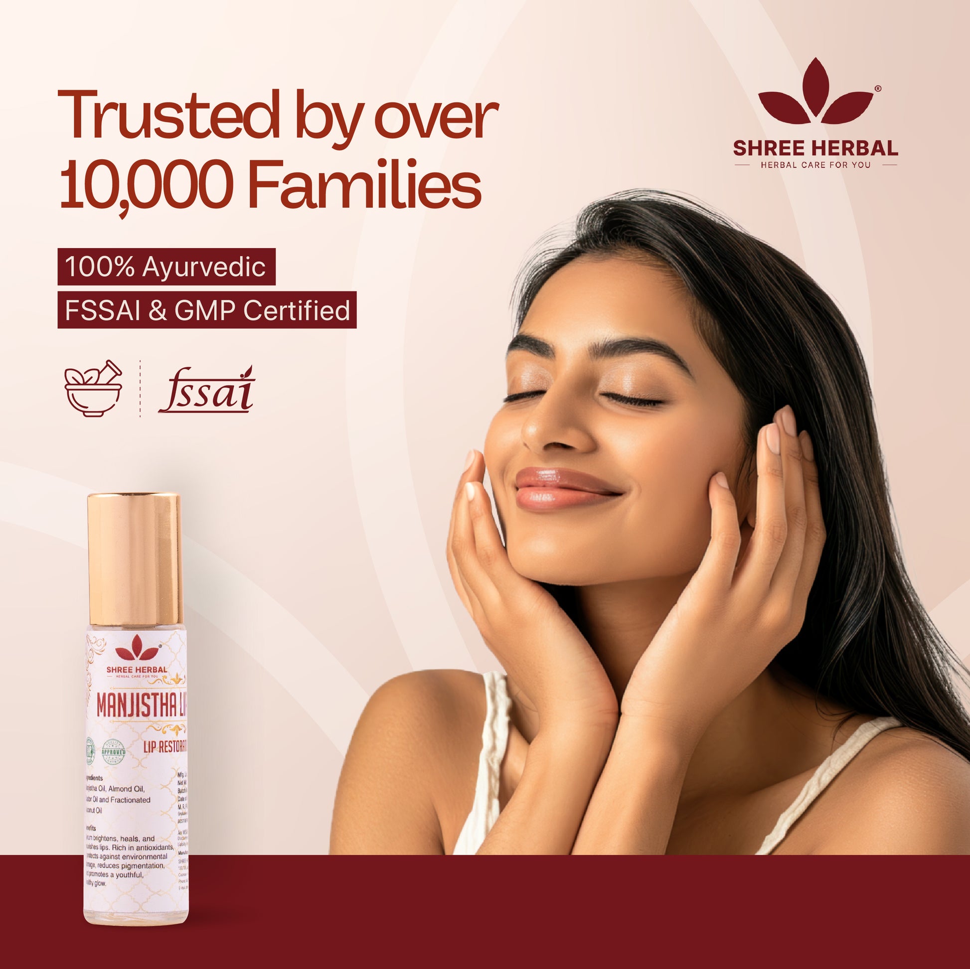 Manjistha is key for Rakta-Shodhana (purification of lip tissue), actively combating Vyanga (darkening/pigmentation) and dullness to restore a natural Varnya (bright hue).
