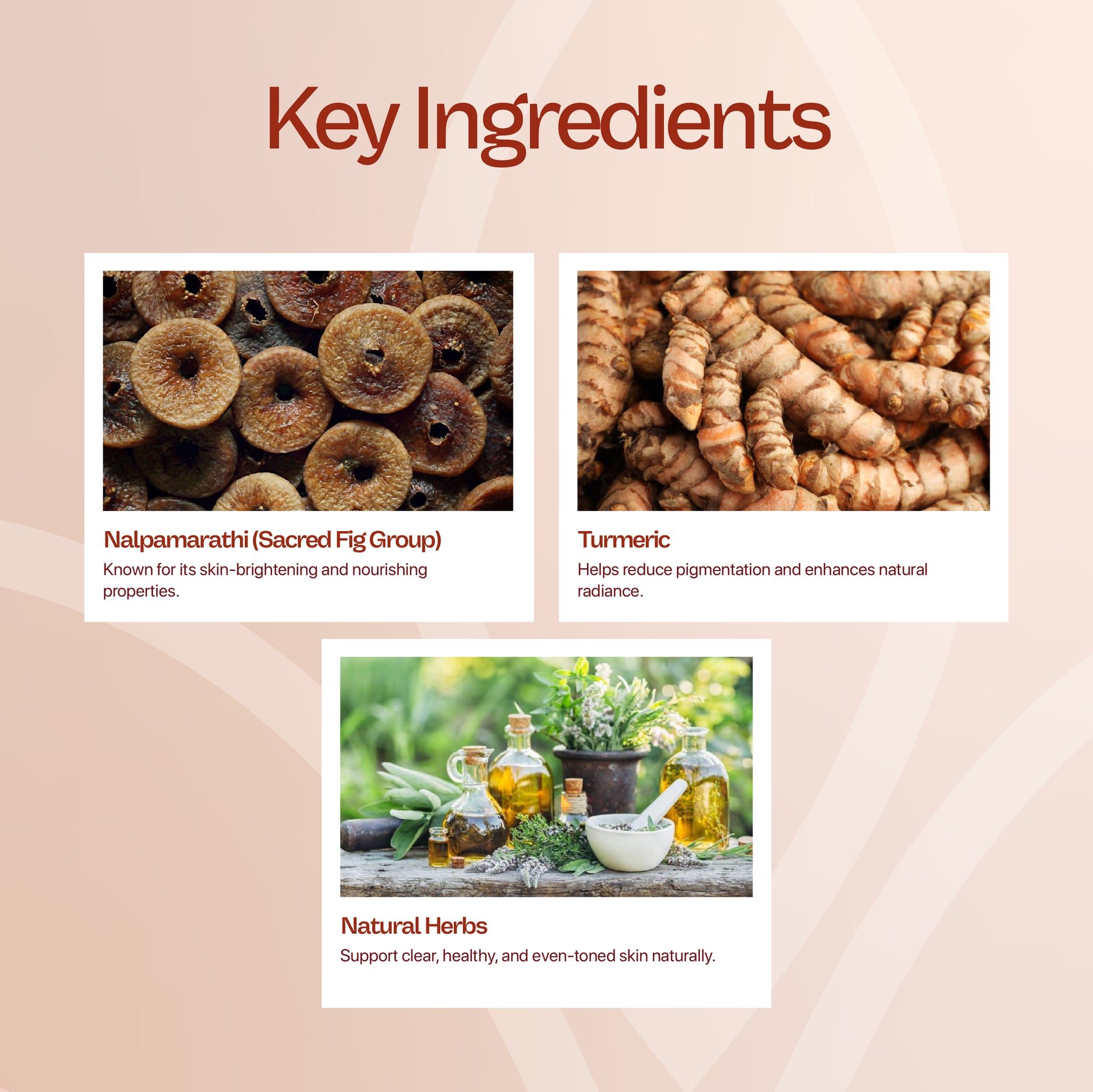 Turmeric (Haridra), with curcumin and natural antioxidants, reduces melanin overproduction and free-radical damage, helping diminish pigmentation and imparting a radiant, even-toned complexion.
