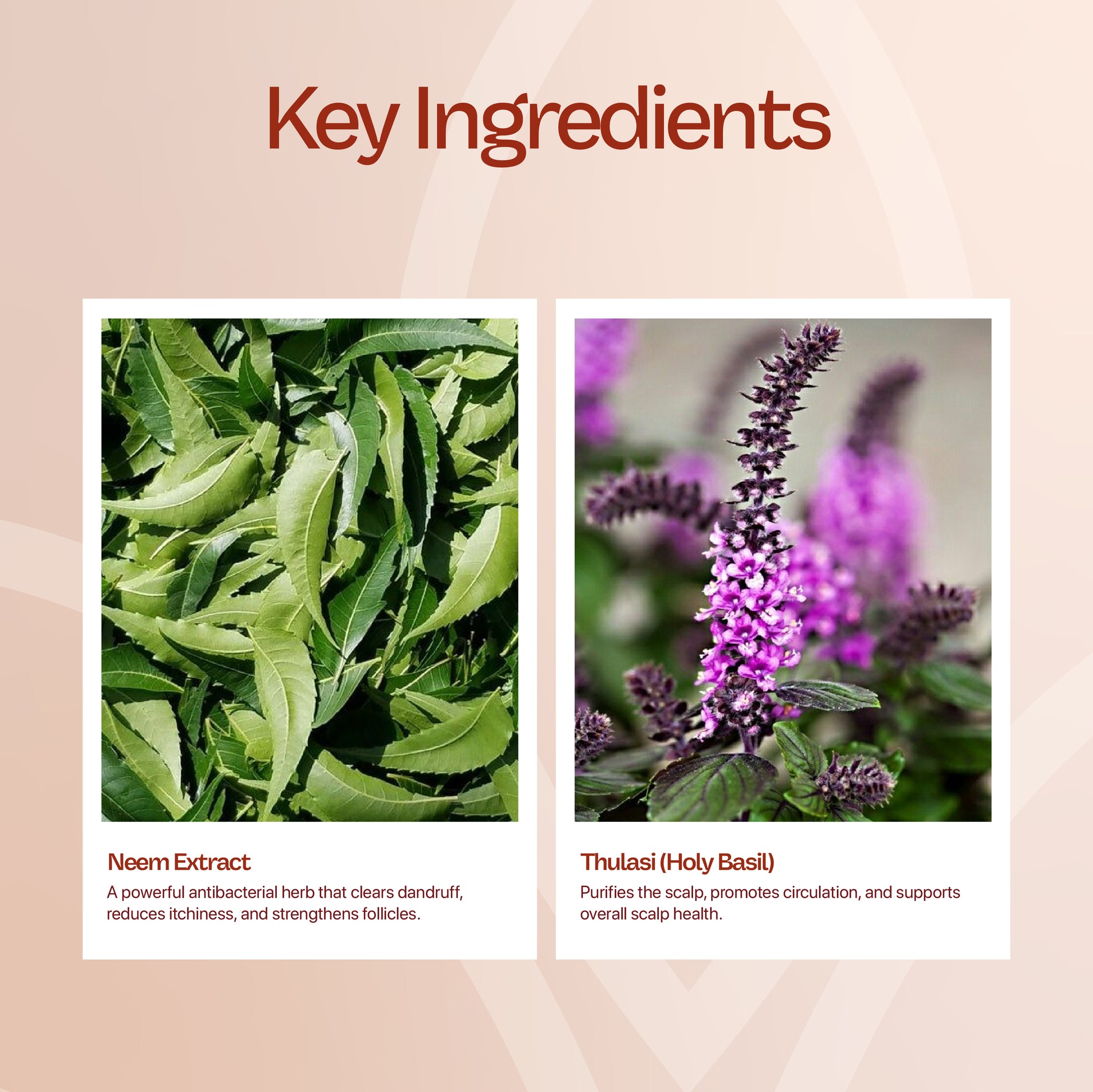 Neem and Tulsi provide profound Sodhana (purification), clearing Kleda (dampness) and Ama (toxins/buildup) from the scalp, offering effective Kapha-Shamana.